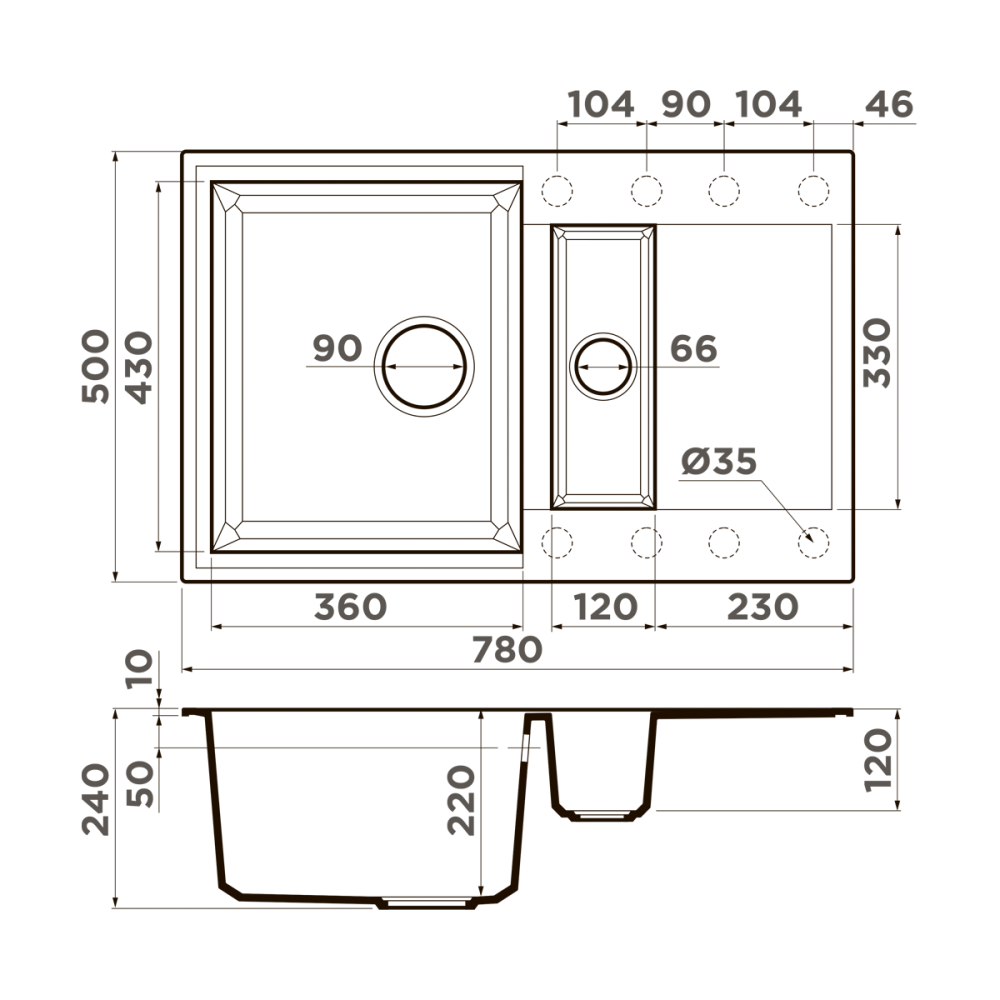 Мойка кухонная Omoikiri из коллекции Sakaime 78-2-BE имеет размеры 780х500 мм., изготовлена из искусственного гранита. Форма — прямоугольная, одна чаша без отверстия для смесителя. Сифон в комплекте. Ширина чаши 36. Врезной монтаж.