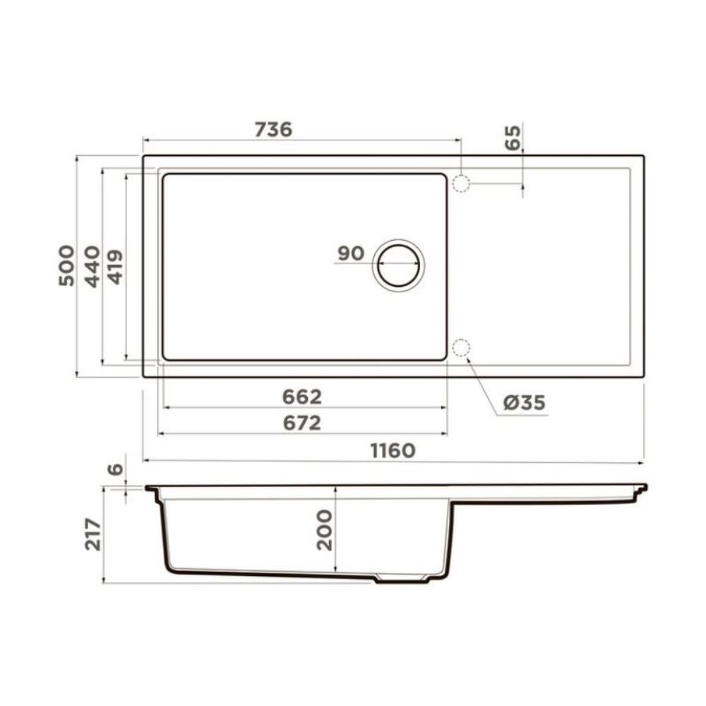 Мойка кухонная Omoikiri из коллекции Sintesi 116-GB имеет размеры 1160х500 мм., изготовлена из искусственной керамики. Форма — прямоугольная, одна чаша без отверстия для смесителя. Сифон в комплекте. Ширина чаши 66,2. Врезной монтаж. Имеется крыло.