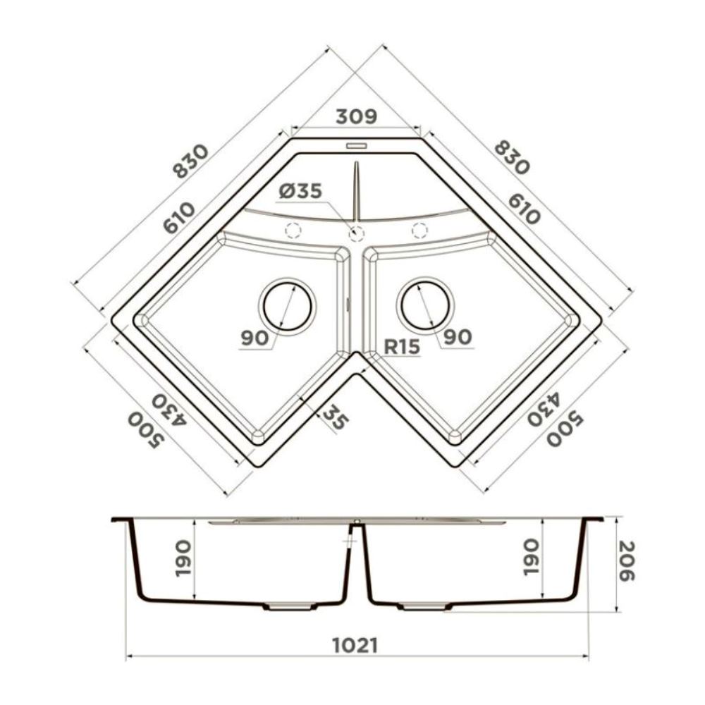 Мойка кухонная Omoikiri из коллекции Sumi 83C-BL имеет размеры 1021х830 мм., изготовлена из искусственного гранита. Форма — угловая, две чаши без отверстия для смесителя. Сифон в комплекте. Ширина чаши 43. Врезной монтаж