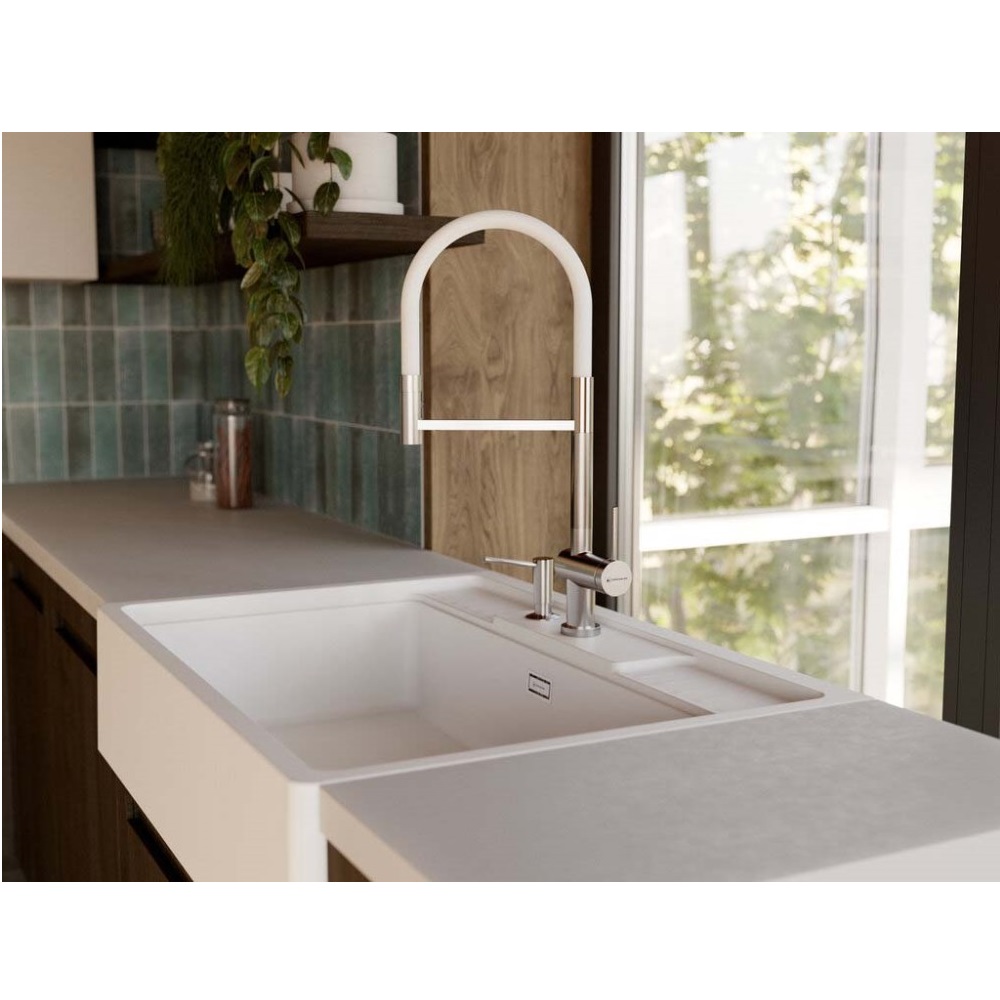 Смеситель для кухни Omoikiri Kanto-2 Plus с подключением фильтра оснащен рычажным управлением для регулировки температуры и напора воды. Горизонтальный монтаж на 1 отверстие. Гибкий излив 220 мм.
