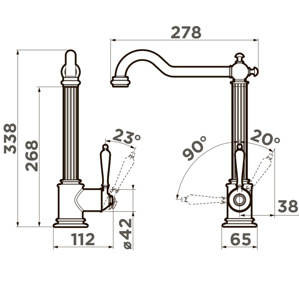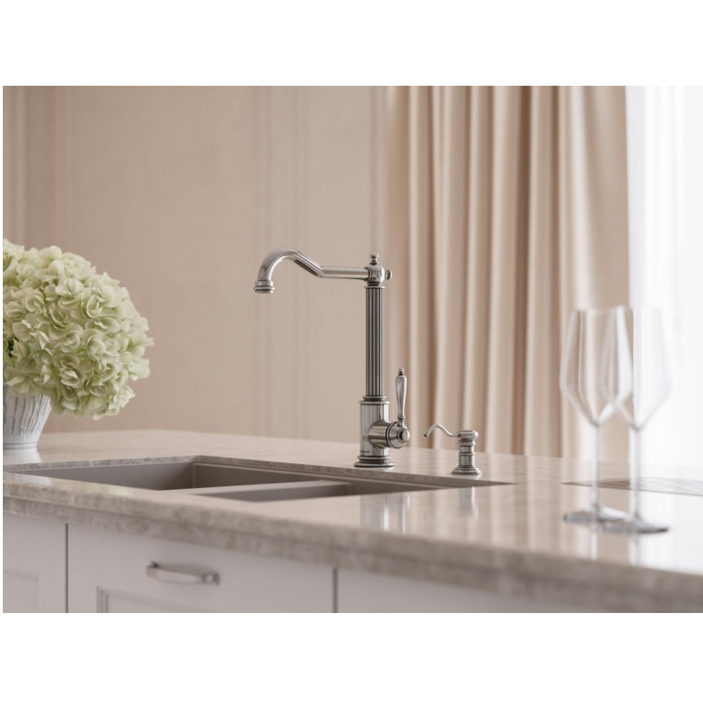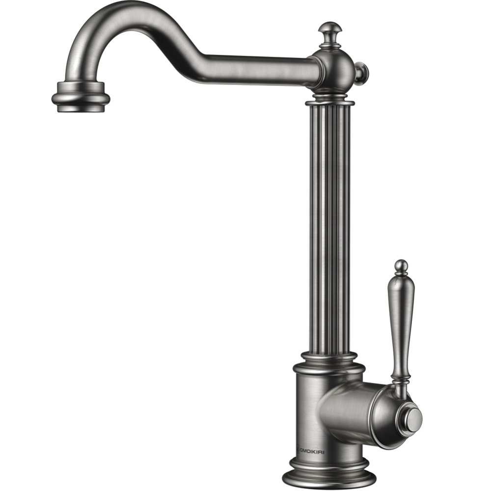 Смеситель для кухни Omoikiri Toshima оснащен рычажным управлением для регулировки температуры и напора воды. Горизонтальный монтаж на 1 отверстие. Поворотный излив 278 мм.